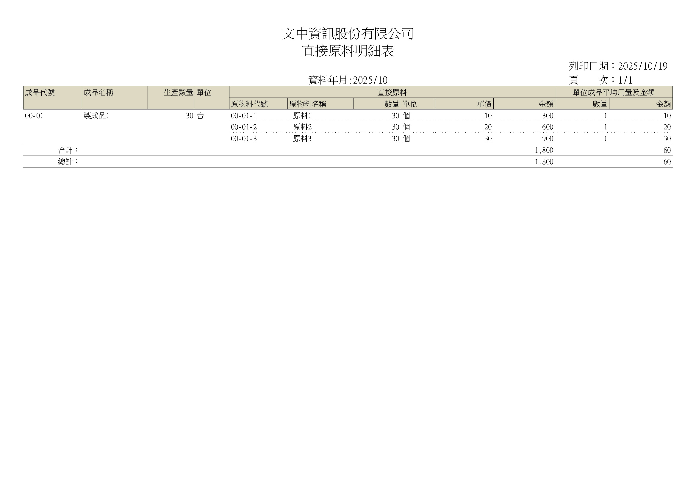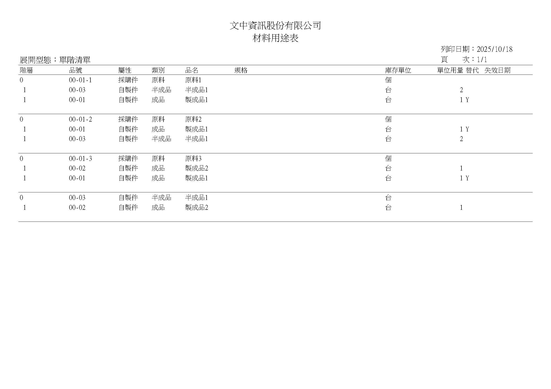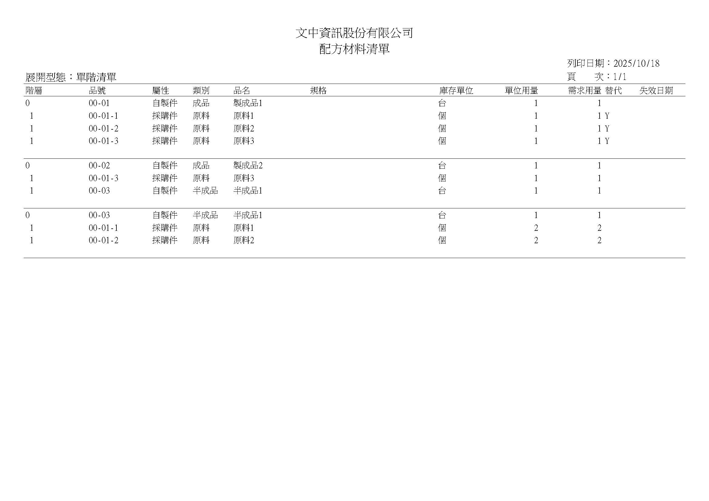 配方材料清單-單階