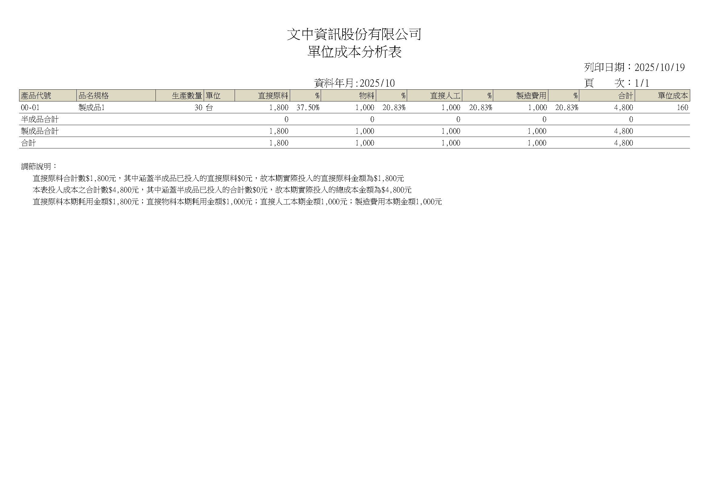 單位成本分析表